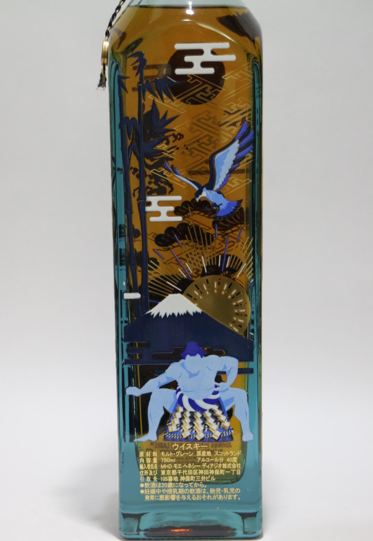 ※透明パッケージはついておりません。 "一万樽に一樽の奇跡"と称される究極のブレンドだという 「ジョニーウォーカー ブルーラベル」 芳醇でスモーキー、そして力強く心地よい余韻が特徴だという ブルーラベルの日本限定かつ数量限定バージョンが同商品になります。 コンセプトは日本・伝統・進化・祝い。ボトルの各面には それらを表すように、力士や能楽師の姿、鷹や鯉、富士山に 日の出といった、日本の伝統文化を象徴する数々の縁起物が、 同ブランドの象徴であるストライディングマンと共に デザインされています。ジョニーウォーカー0